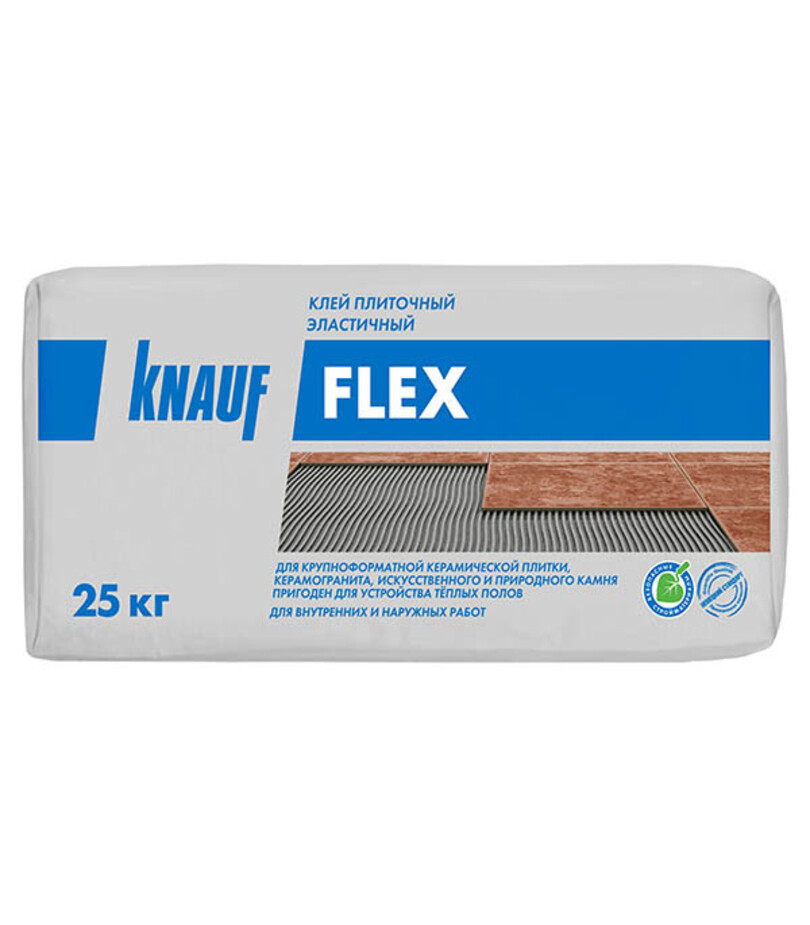 Смесь Кнауф-Флекс предназначена для облицовки внутри и снаружи зданий (включая цоколь): стен керамической плиткой, керамогранитом, природным и искусственным камнем.Рекомендуется для облицовки поверхностей с повышенными нагрузками и высокой проходимостью, отапливаемых полов, террас, балконов,деформируемых оснований (например ЦСП). Применяется для облицовки чаш крытых бассейнов.Класс клея согласно ГОСТ Р 56387-2018 – С2 S1